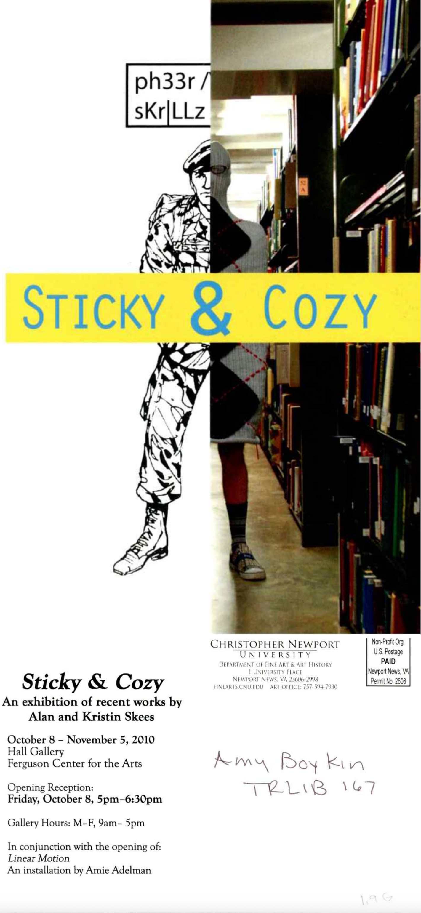 A postcard announcing the opening of "Sticky & Cozy: An exhibition of recent works by Alan and Kristin Skees."