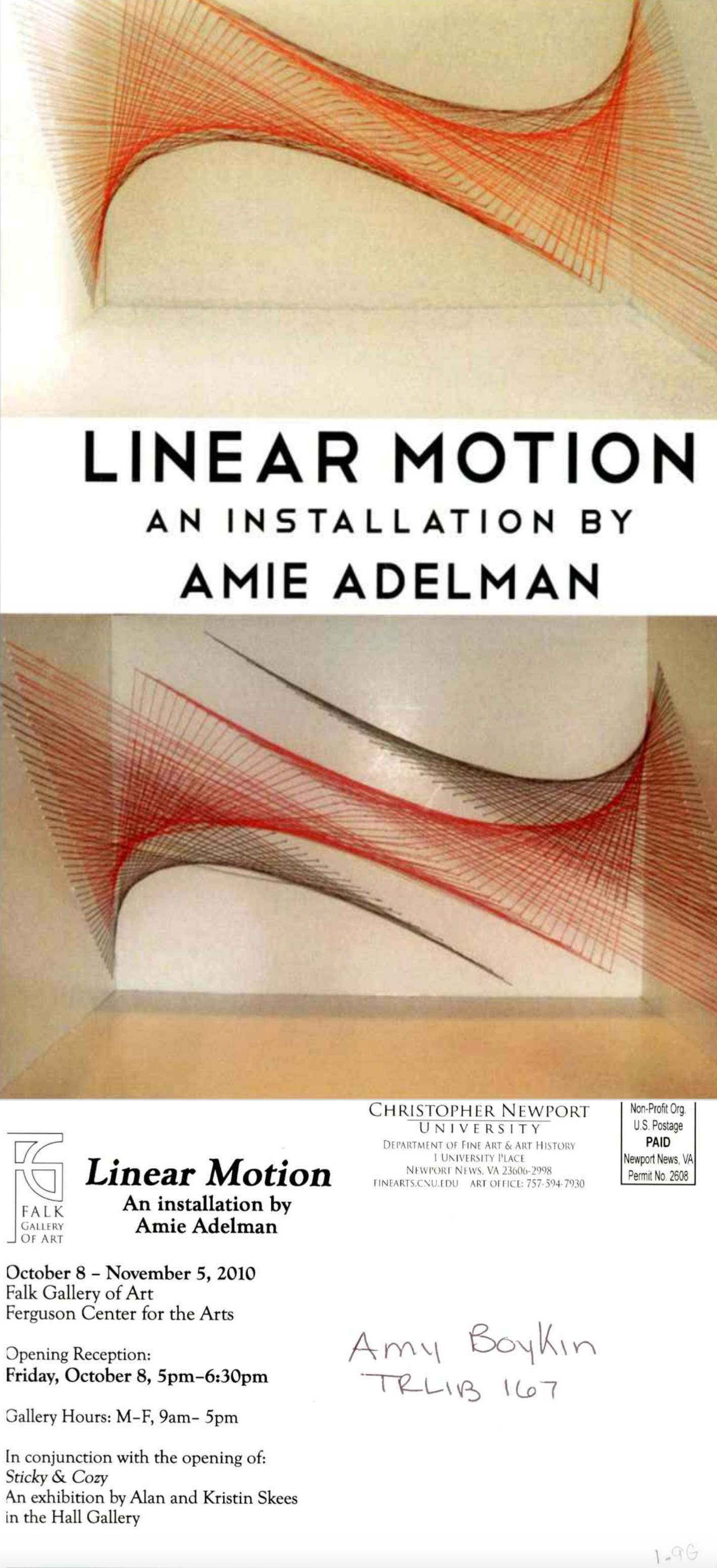 A postcard announcing the opening of "Linear Motion: An installation by Amie Adelman."