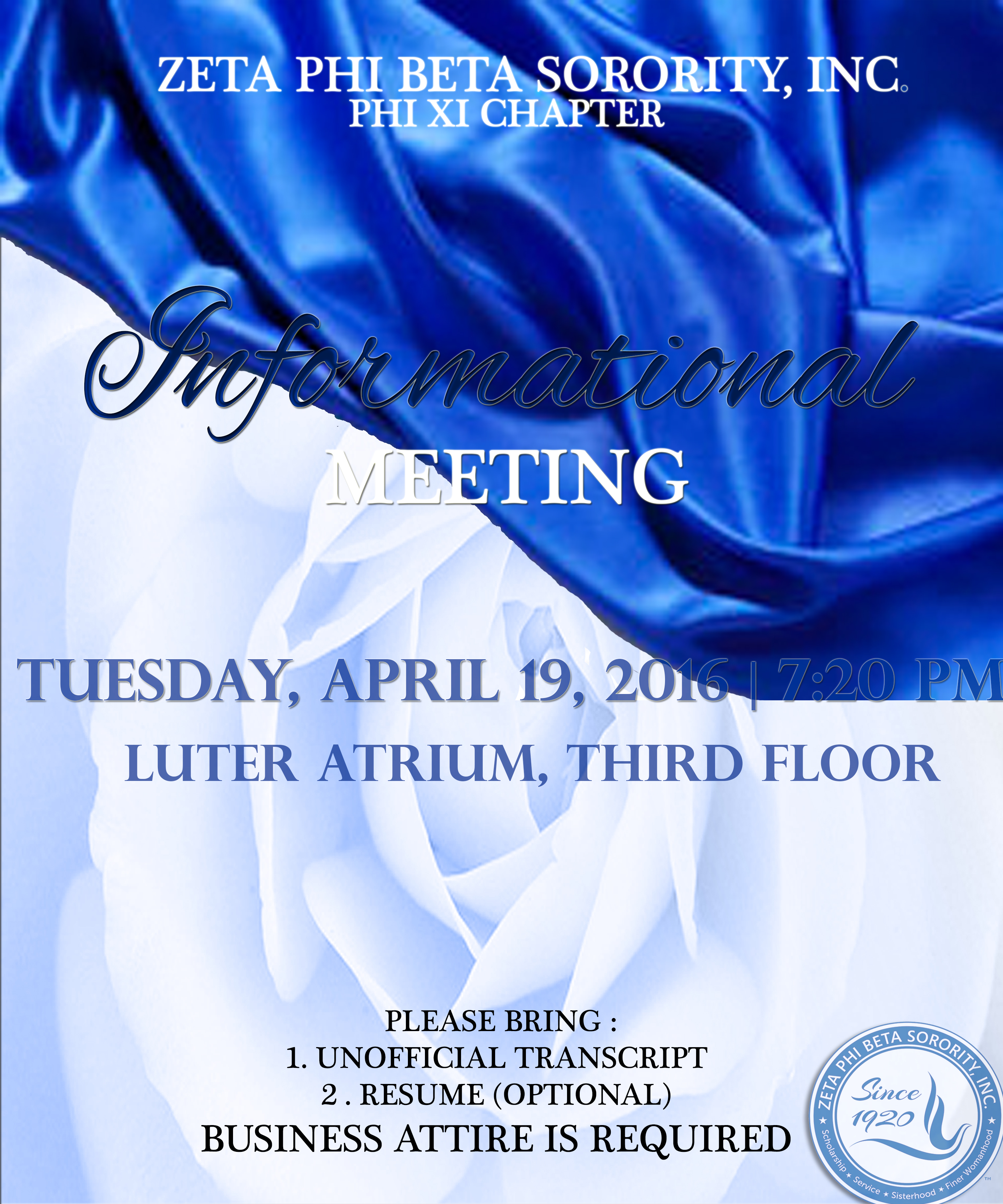 Zeta Phi Beta Sorority Informational Meeting: 7:20pm